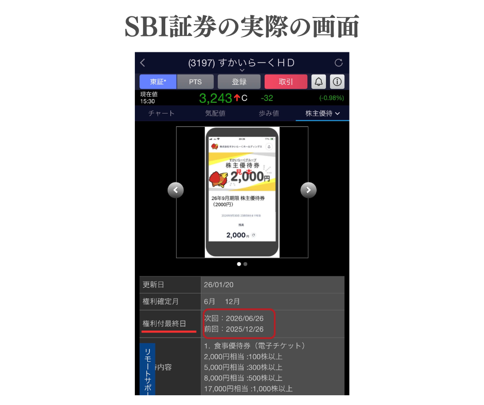 例えば、優待で人気銘柄のすかいらーくの権利付け最終日は2026年6月26日と2026年12月26日です。