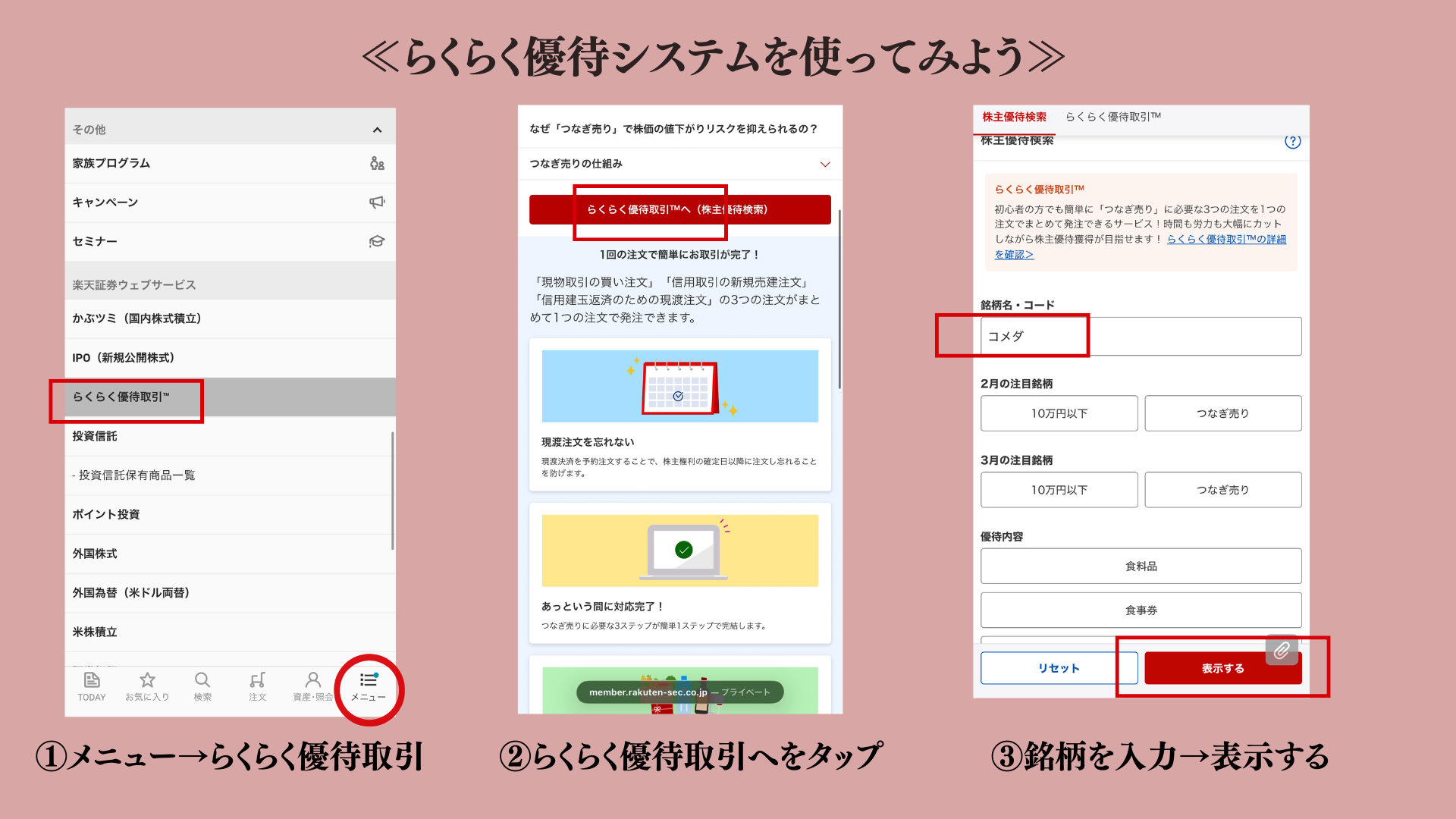 らくらく優待システムは株主優待を株価の変動リスクを気にすることなく、数百円の手数料でGETできる『クロス取引(つなぎ売り)』を、最小限のボタン操作で行える画期的なサービスです。